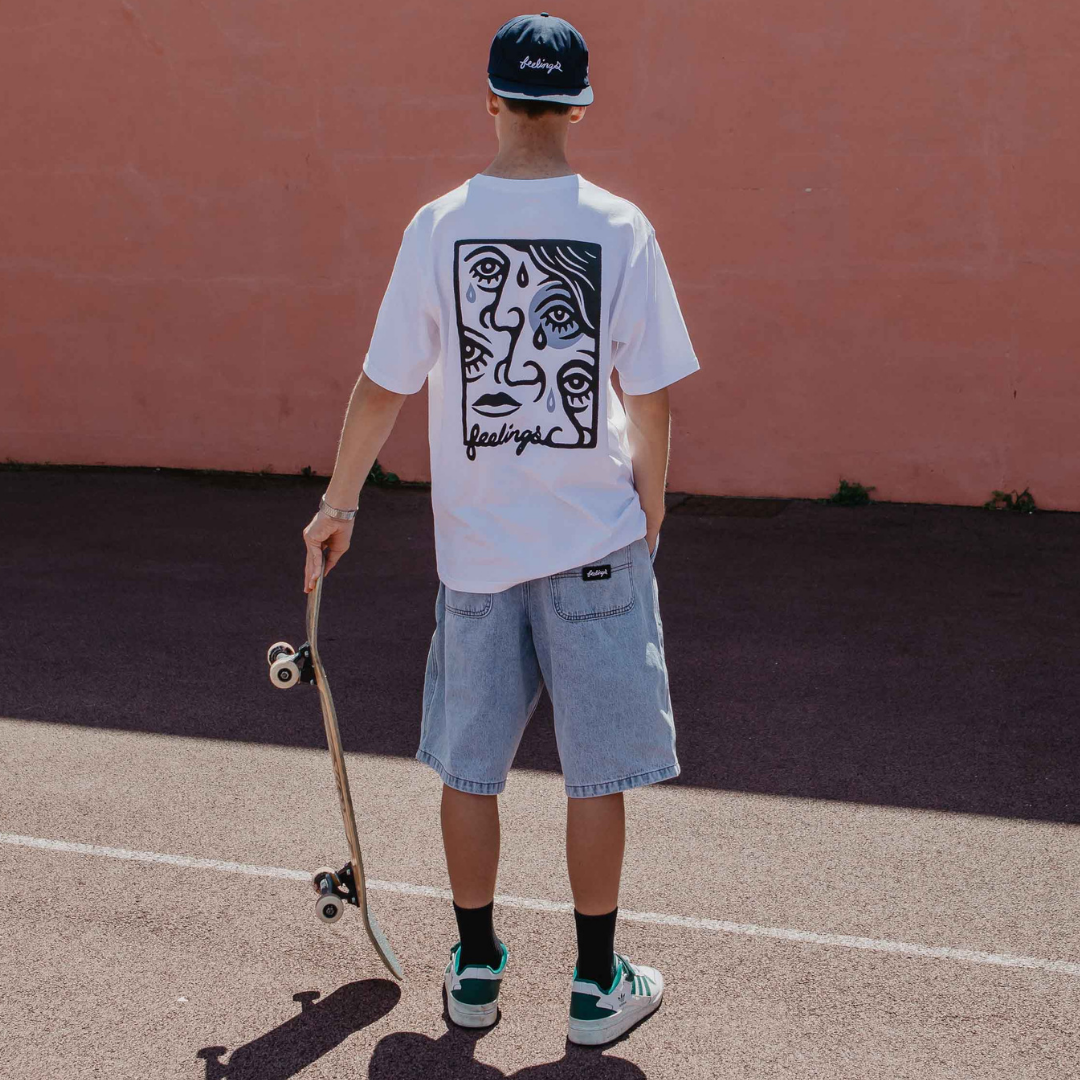 Couleur indigo clair Coupe droite décontractée, taille régulière Délavage à la pierre de qualité Denim 100% coton 13oz - 360g Cordon épais réglable à la taille Écusson And Feelings sur la poche arrière droite Coutures contrastées Fermeture éclair YKK Poche en chevrons avec impressions artistiques originales à l'intérieur Le modèle mesure 1,78m et porte une taille 32